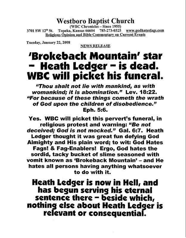 One last thing: for those who haven’t see it, this is a flier from the Westboro Baptist Church in Topeka, Kansas, calling for a picketing of Ledger’s funeral in order to gleefully send him off to Hell for participating in Brokeback Mountain, claiming his death as a victory for God, and saying that this performance, this sin, is the only thing “relevant or consequential” he ever did. My first instinct was to picket the picketing with a simple Let He Who Is Without Sin… placard, but I prefer Jon Sung‘s idea: “a bunch of people dressed as Batman and the Joker beat the living shit out of [the WBC] in full view of news cameras.”