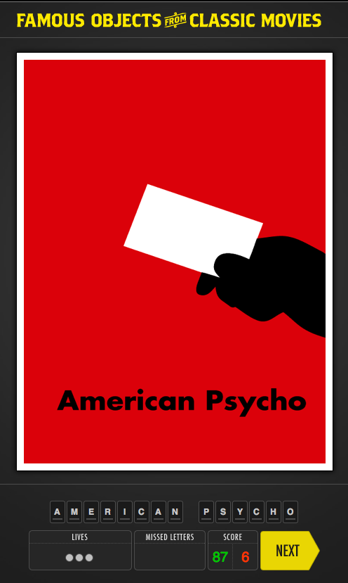 Maud reblogged this on her Tumblr account, and I attempted to trace it back to its source, and in doing so discovered that so, so, so many people had re-Tumblred it that it seemed like some sort of glaring error that I hadn’t included it in my collection of screen-shown business cards. This was further and quite quickly confirmed by the rapid-fire pullulation of links to this hangman-style movie quiz, which used Mr. Bateman’s proffering of his business card as it’s iconic object. Not the celebrated axe. A business card.