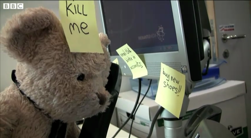 Watching a Misery Bear video, I laughed at the instance of a Post-It note on his head, as it reminded me of one of my favorite moments from Gilmore Girls. I think there must be, like the business cards, a whole big stash of of variations on this image out there. But, like American Psycho, I likely haven’t seen them. Also, I think I need a catchy term for them. Post-It Heads? Head-It Notes? Ugh, and double-ugh; nothing works, so far. So, until I figure out something more compelling to do, here are the two I do have.