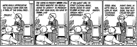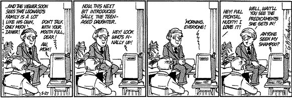 Interesting news, you might say. Envelope pushing, even. But Doonesbury effectively covered this already… in 1978. At the time, Freddy Silverman, former president of ABC, came over to NBC to sex up their programming, and Trudeau produced a few strips to satirize the timbre of the possible consultation.