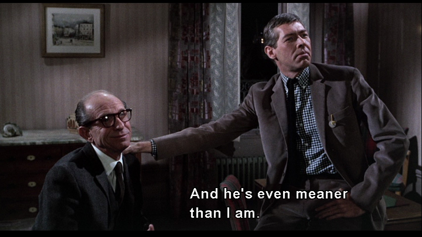 Almost, but not quite. Let us begin with the three hapless war profiteers that are trying so hard throughout the film to recover the paltry quarter of a million dollars they secreted away during World War II (in his commentary for the UK DVD of the film, Ken Barnes claims the first place where the film seems dated is in the use of a record player at the funeral home, but the second is most certainly the film’s Dr. Evil-esque insistence that $250,000 is a lot of money*). They are the film’s three threatening bears: Scobie is too hot, Gideon is too cold, and Tex Panthollow is jussssst right, which is why he survives the longest (“My momma di’nt raise no stupid children”).