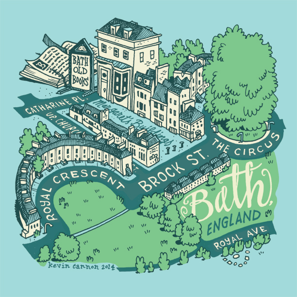 A month or so ago, The Comics Reporter posted a link to a commission page by Kevin Cannon, wherein he would draw for you your favorite intersection. Cannon is part of Big Time Attic, the Minneapolis-based comic studio that worked on two graphic novels for Jim Ottoviani and which is also comprised of Zander Cannon (no relation), who wrote and illustrated the bizarre and convoluted Chainsaw Vigilante series for NEC Comics back in the day. When I read about the intersection project, it made perfect sense and was surprising at the same time: I knew that BTA had done a number of maps for various magazines and publications, but I simultaneously couldn’t think of anyone who would have a favorite intersection, let alone who would want a drawing of it. My old boss used to have drawings made and photos taken of each of her apartments whenever she moved, collecting a mini-gallery of her past history, but I didn’t think that people would be able to say, “Ah, yes, the corner of 16th Street and Prospect Park West… that’s my favorite place.” But as I was contemplating that, I suddenly found that intersection in my memory, that place where I used to walk and feel a particular balance of familiarity and opportunity, of destination and arrival. And so I had him draw it: the pedestrian walkway between the Royal Crescent and the Circus in Bath, a block away from my apartment. He put the image up online, and it was wonderful, but it was even more amazing to receive the elegantly packaged slim, black envelope with the actual square of Bristol inside. It was the place I remembered, but interpreted, compressed, idealized, and filigreed in such a way that I was surprised and gladdened.