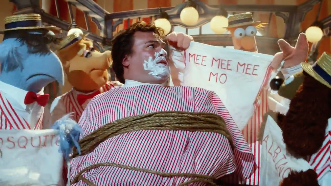 Well, it’s a small thing, but the second The Muppets begins, with the above title card floating in a hazy 4:3 aspect ratio in the middle of a wide screen, this film marks itself as separate from all other Muppet films: by unadorned use of pop music. The Muppet Show was, of course, no stranger to either use of or focus on a contemporary hit or a died-in-the-wool radio classic, let alone folk songs or ballads. But while covers and musical guests filled out the television shows, the films have always seemed to eschew anything except original music. The Muppets has its fair share of original songs, but the very first impression is one of nostalgia, deliberately evoked by Paul Simon’s ’72 release “Me and Julio Down by the Schoolyard”. For a film that’s about creating a bridge between the current generation and the previous, culminating in a demonstration that the fans of the Muppets never really went away, it’s a clear (possibly manipulative) way of evoking the past. This is undercut only by the fact that young people may not actually connect with a chipper playground tune by half of a sixties folk-duo, and not-young people, like me, may have the song already firmly and inexorably assigned in their heads to the Royal Tenenbaums montage.