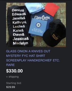 So what am I concerned about? That Netflix doesn’t need to merch their offerings. The likelihood of a soundtrack album or a Blu-Ray release for Glass Onion isn’t guaranteed. It turns out there are more commercial album releases from Netflix original pictures than I might have anticipated, but I certainly don’t want to get into an equivalent bidding war as I did three years ago with eBay people if there are hot-ticket For Your Consideration items for Glass Onion. The borrowed prestige, limited availability, and speculative value — on the very off chance that it wins! — can make initial prices on any possible limited soundtrack release or fun puzzle box or Mondrian recreation cost more than its practicality. Which doesn’t stop me from wanting any such hypothetical rarity, it just makes me sigh at the sheer war profiteering of the invisible hand of the market.